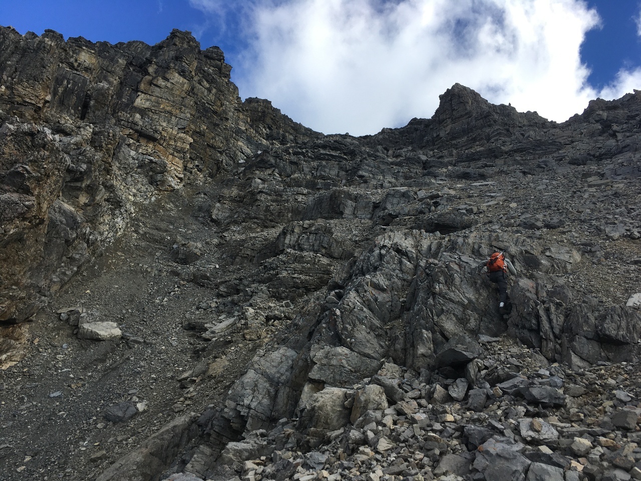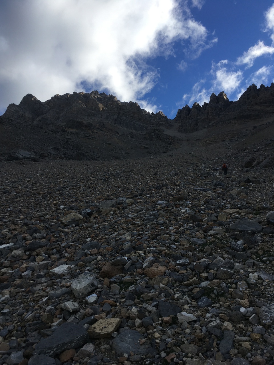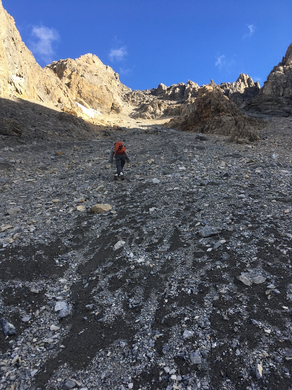 Looking back down the long scree gully. The solid rock was a nice change from the long grind up scree! Photo credit: Dad