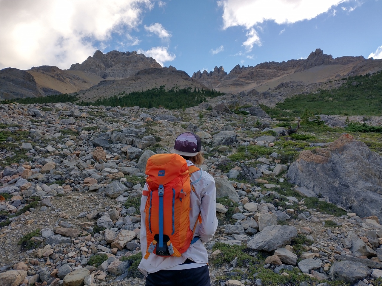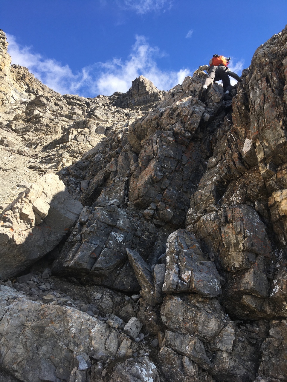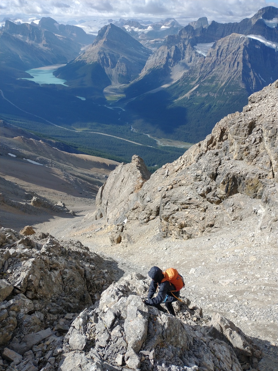 Looking back down the long scree gully. The solid rock was a nice change from the long grind up scree! Photo credit: Dad