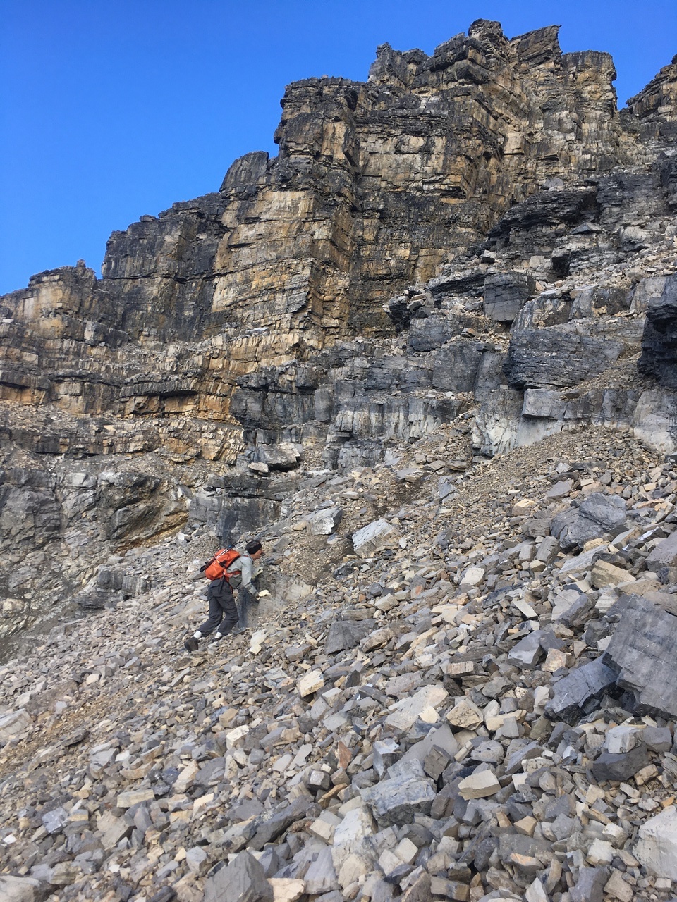 The solid rock eventually degraded to scree-covered ledges.