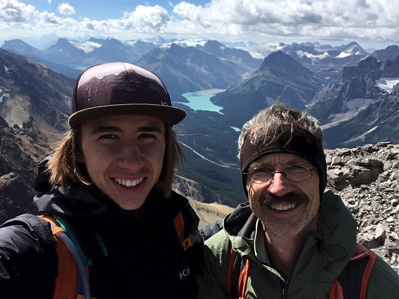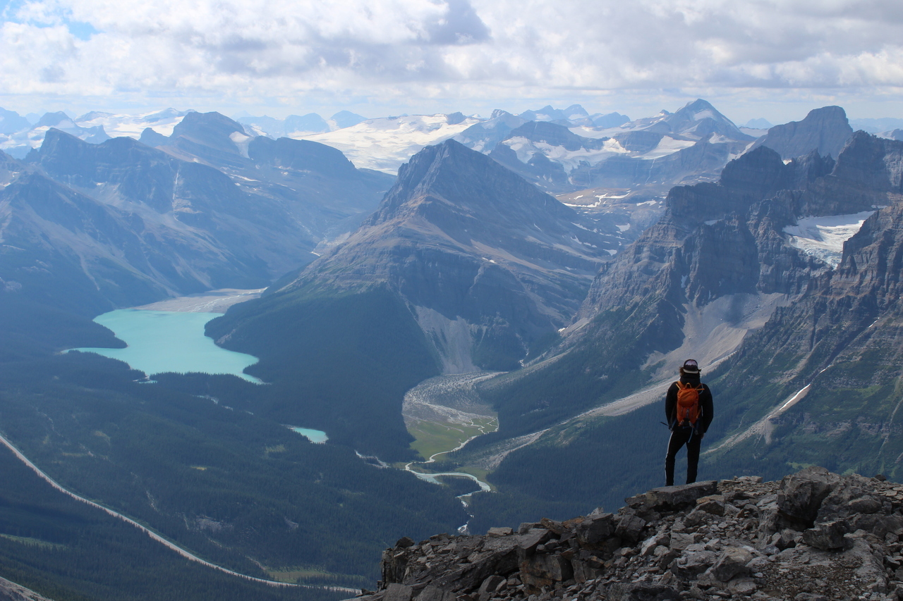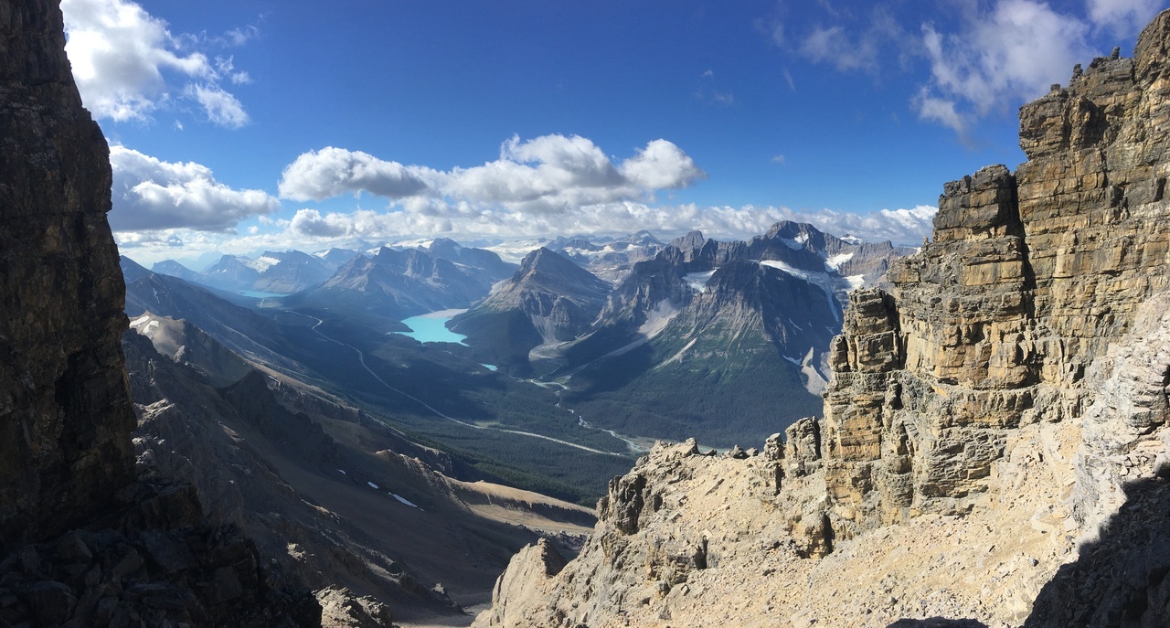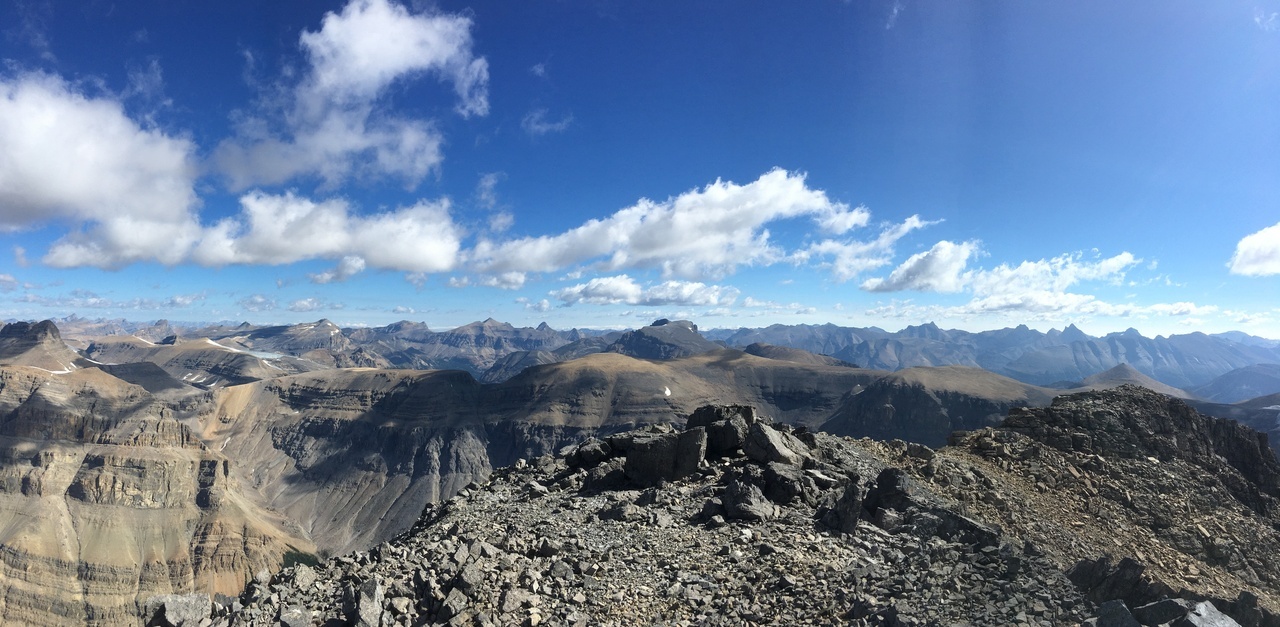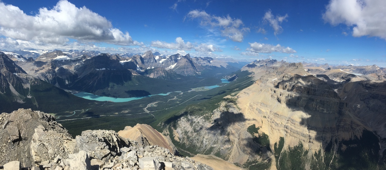 Summit pano with four lakes! Mistaya, Upper and Lower Waterfowl, and Chephren (just a small blue sliver below Mount Chephren itself)!