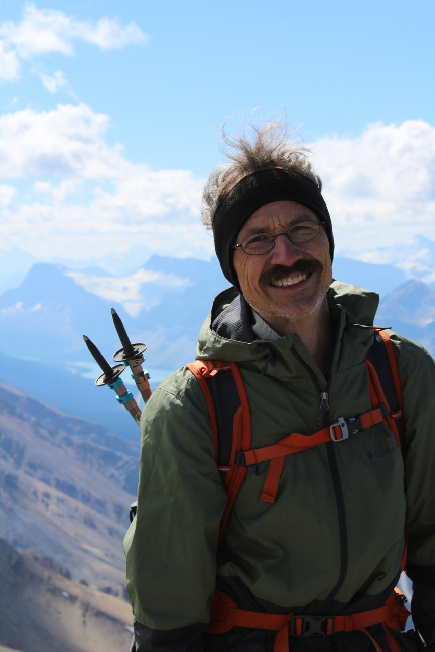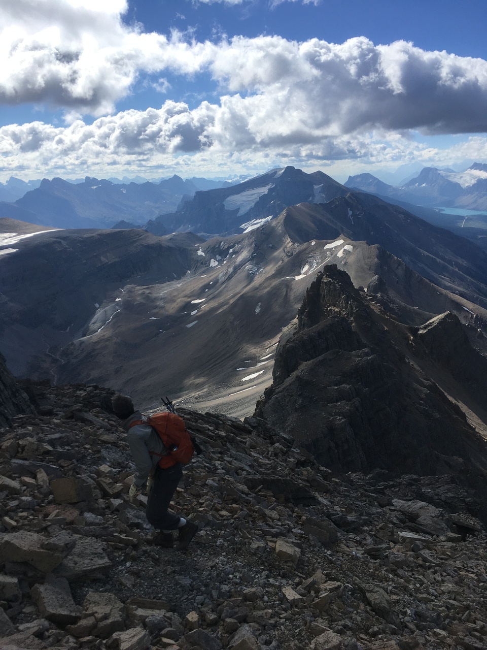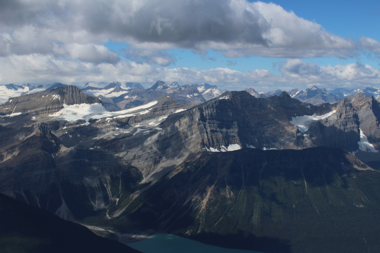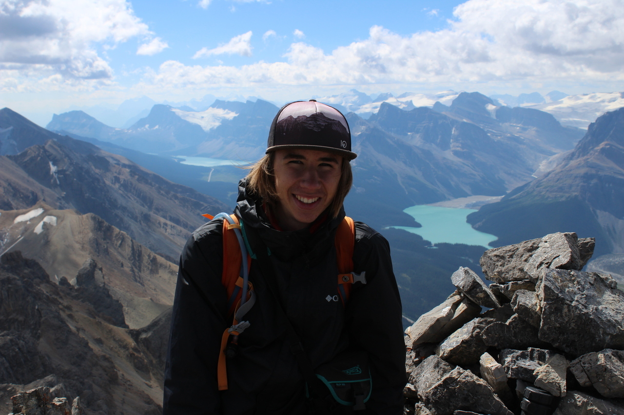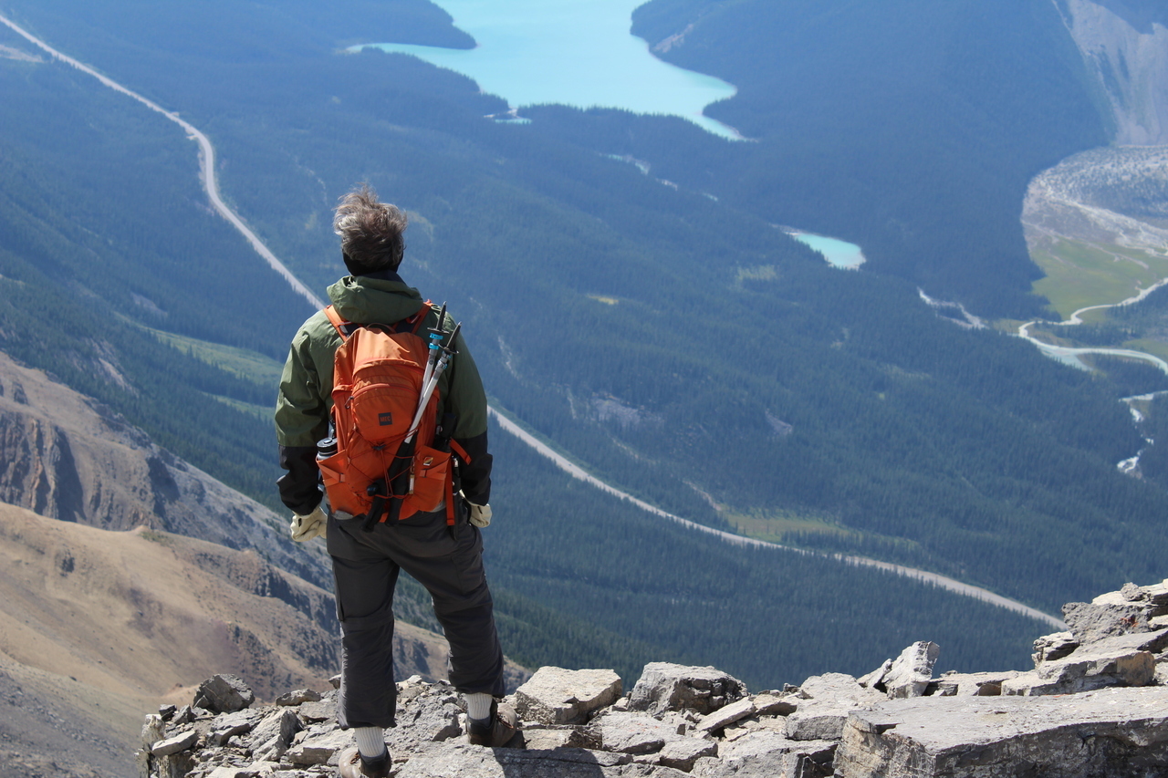 Summit pano with four lakes! Mistaya, Upper and Lower Waterfowl, and Chephren (just a small blue sliver below Mount Chephren itself)!