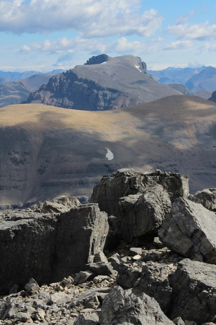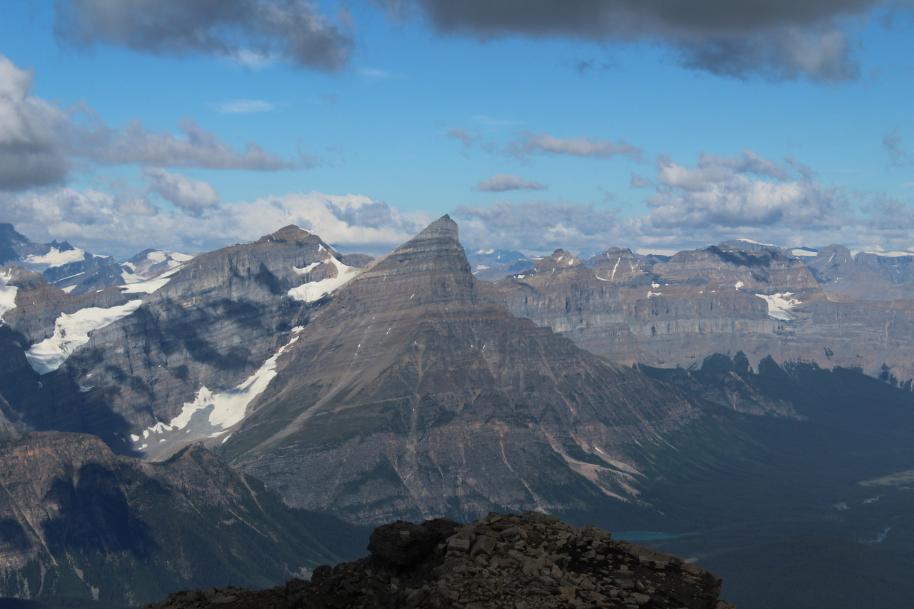 Mount Chephren always stands out! I can't believe a scramble route exists up the slope below the ridge, but then again, I couldn't believe one existed up here either! White Pyramid rises from the col at the base of Chephren's ridge, to the left!