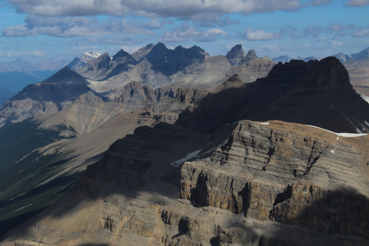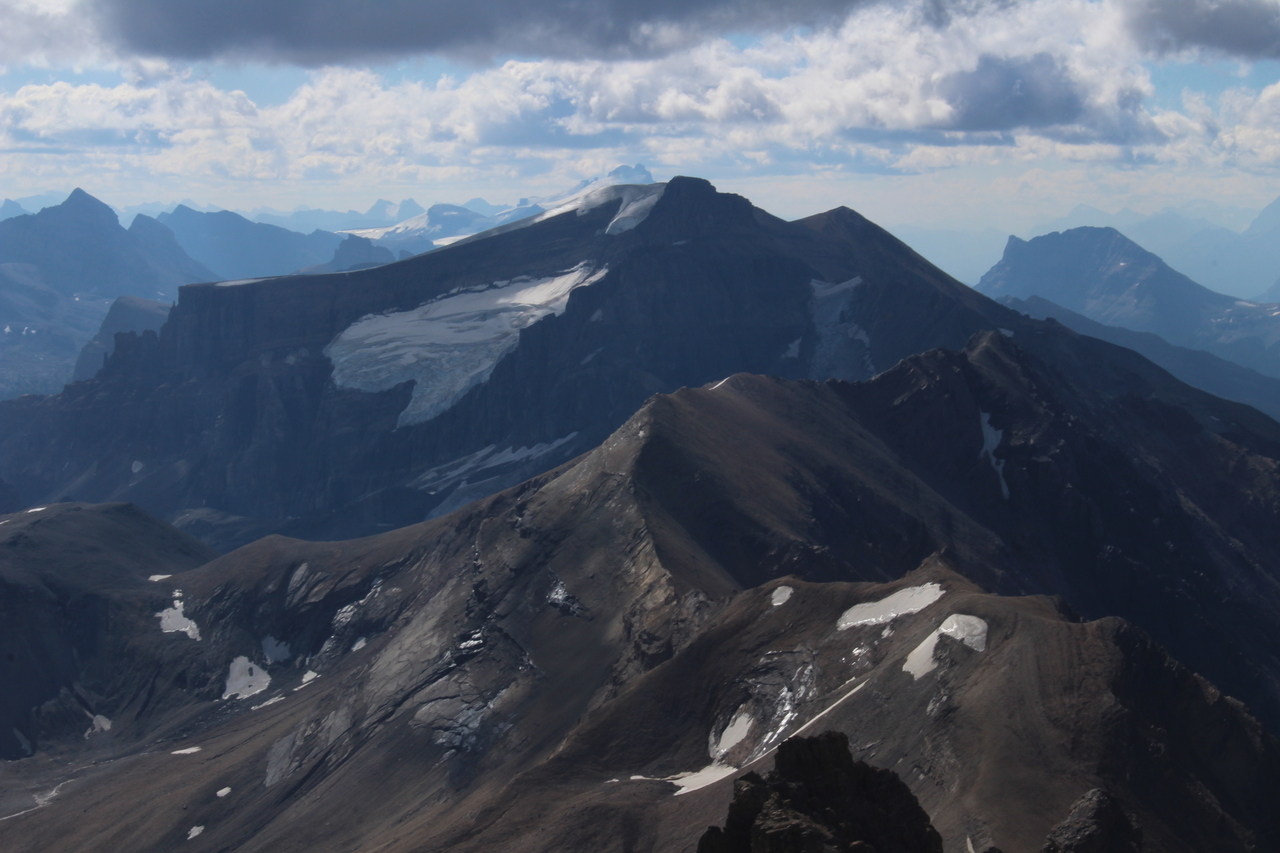 Mount Murchison and all it's towers dominate the view, making Bison Peak look tiny to the left! Glaciated Mount Wilson peeks out in the distance (left) with Mount Noyes in the shadowy foreground (right)!