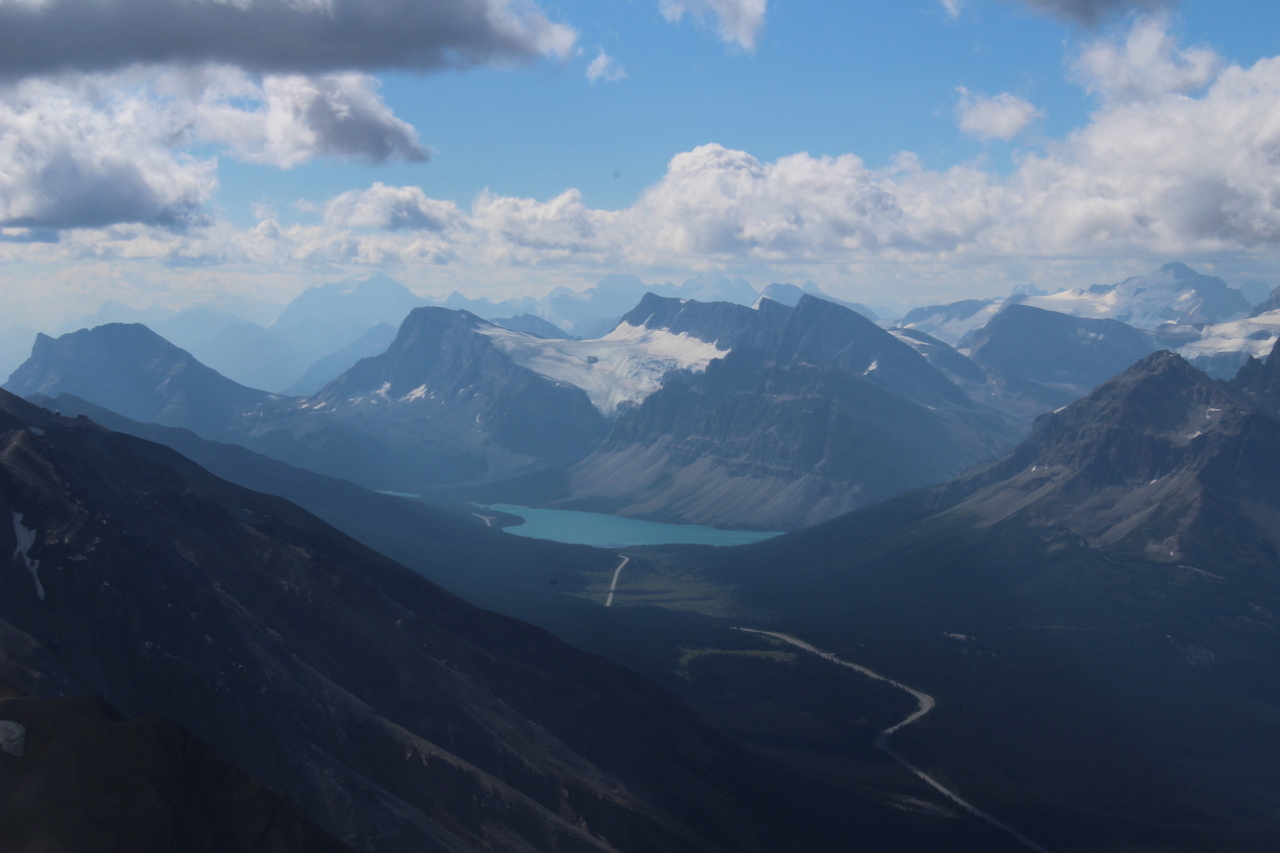 Crowfoot Mountain rises above the length of Bow Lake, with Bow Peak far left, and Mount Temple barely visible in the distant haze between the two!