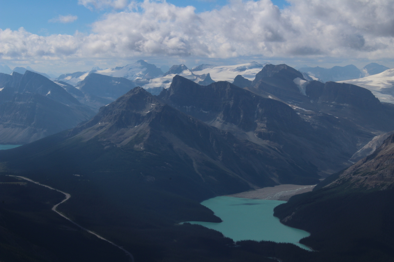 What a view! Caldron Mountain rises to the right of Peyto Lake, with Peyto Peak behind-right and Mistaya Mountain far-right! Glaciated Mounts Rhondda and Habel rise center, with Baker between Peyto and Mistaya! Photo credit: Dad