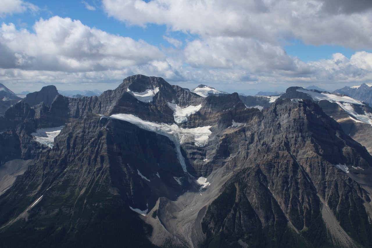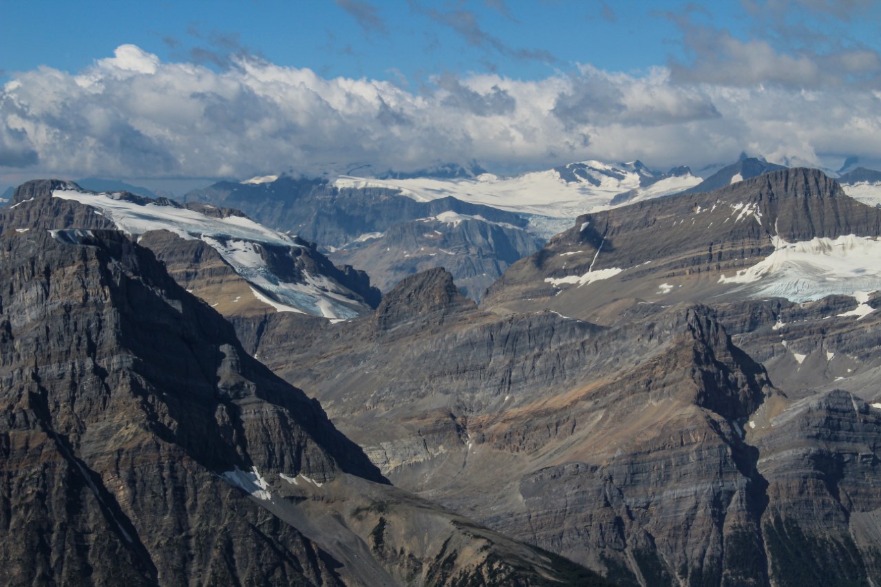 Sandwiched between the far end of Barbette Mountain (left) and Breaker Mountain (right) lie (what I believe to be) glaciated Mounts Mummery and Barlow in the clouds!