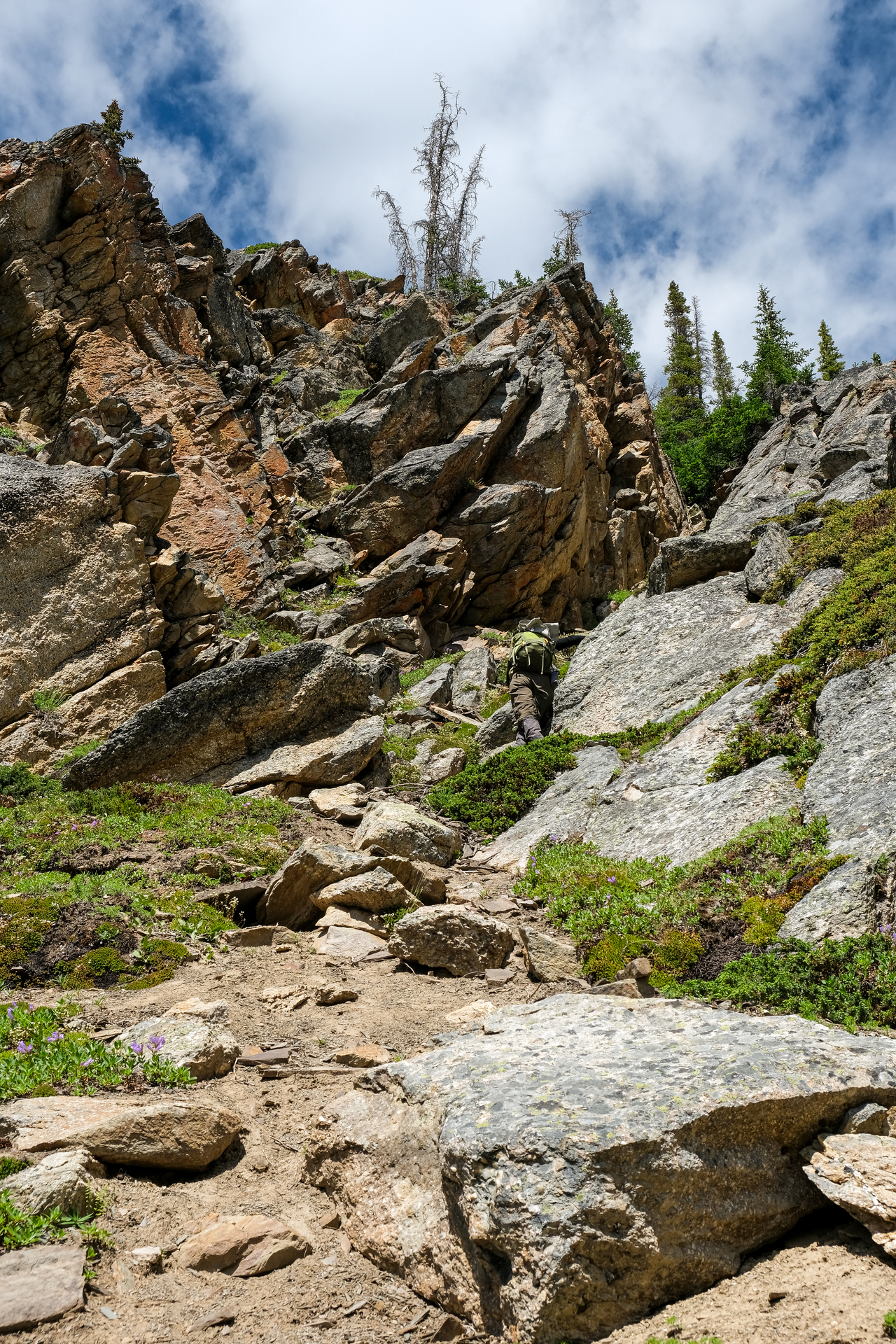 We were absolutely sweating buckets as we hiked up the grassy ski run (🟢 Marmot), with the mid-afternoon sun beating down! I was immediately wondering why I decided it would be a good idea to do a full loop of Redoubt plus this stinkin' ridge in the same day 😂. Eventually, the ski run started to curve up to the right, so we bushwhacked a short distance, soon reaching some open, bouldery terrain at the base of the valley.