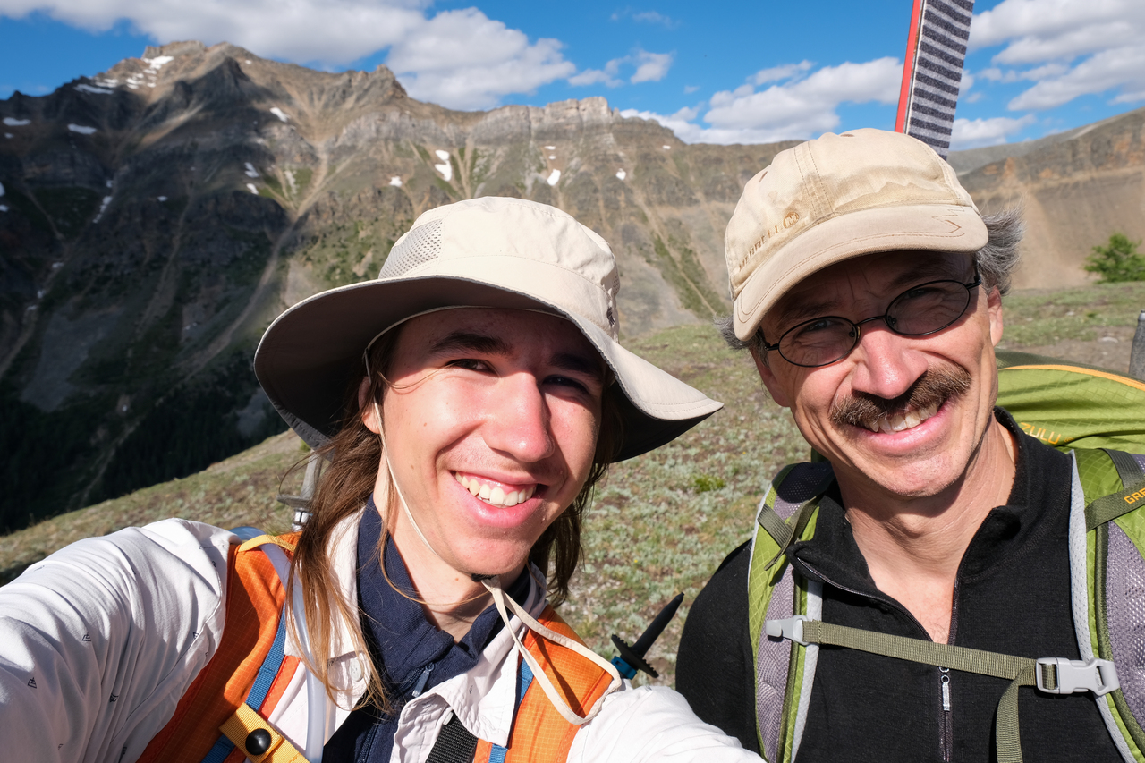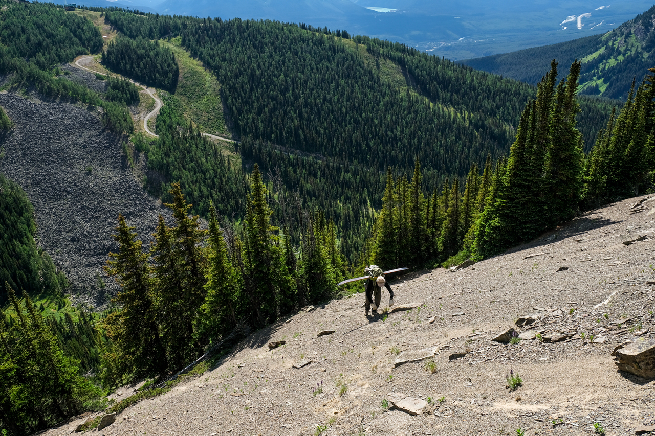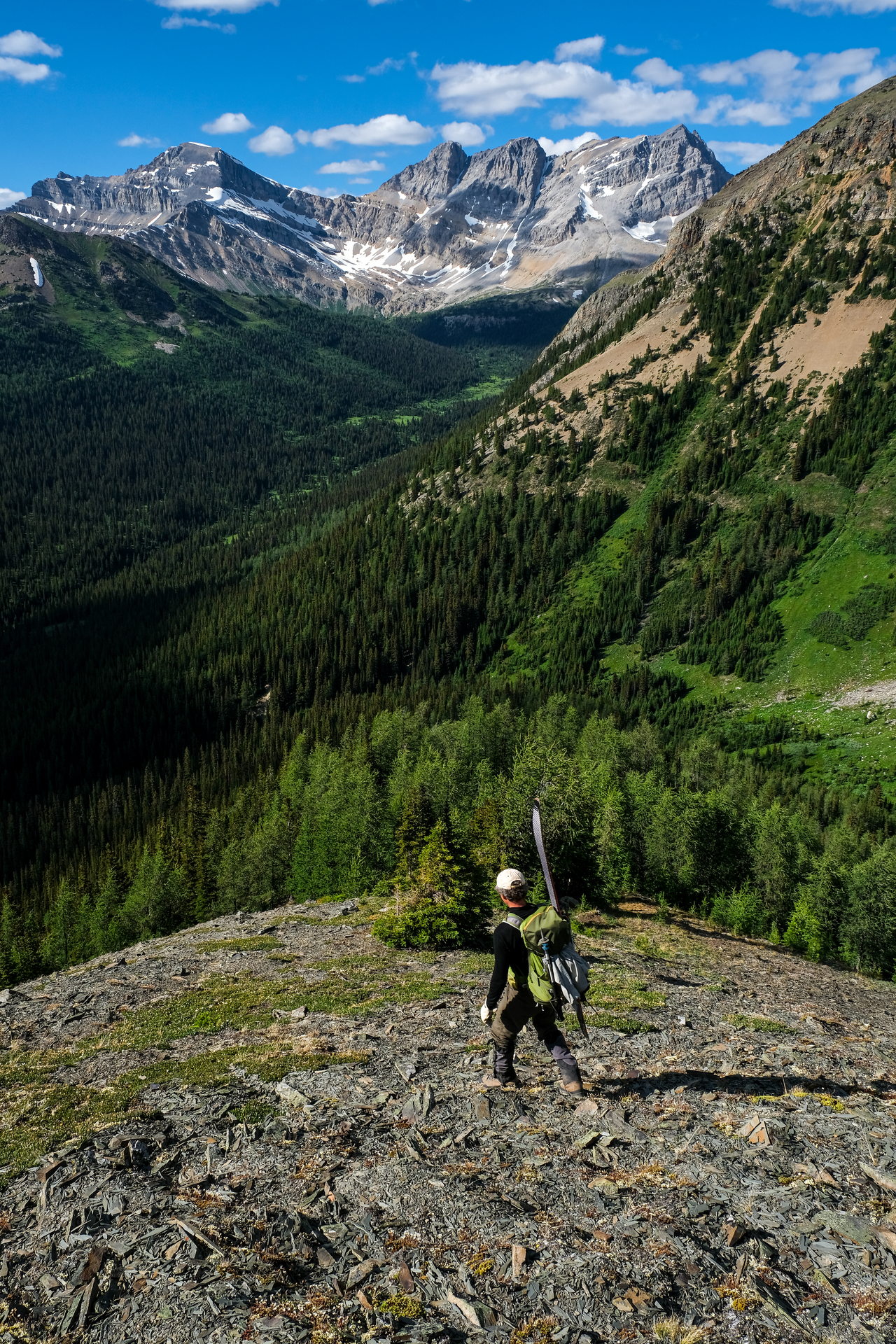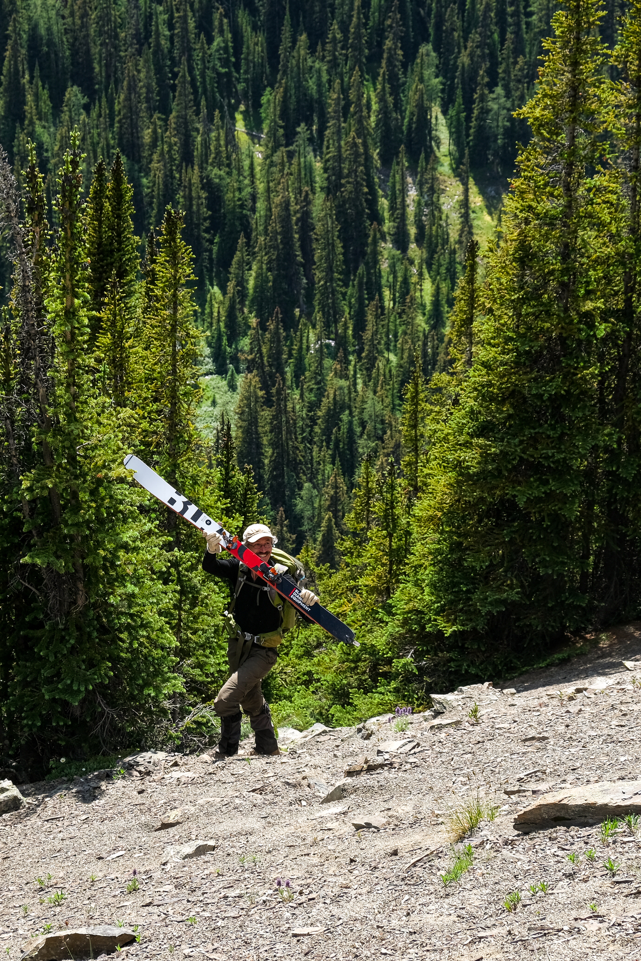 We easily followed the narrow trail for the final short distance down the valley, soon intersecting the well-travelled Skoki backcountry trail, and following it back to the access road. We got a couple funny looks from backpackers as we hiked down the remaining 4.5 km. I guess it's not normal to have a single ski strapped to your pack in the middle of summer 😂.