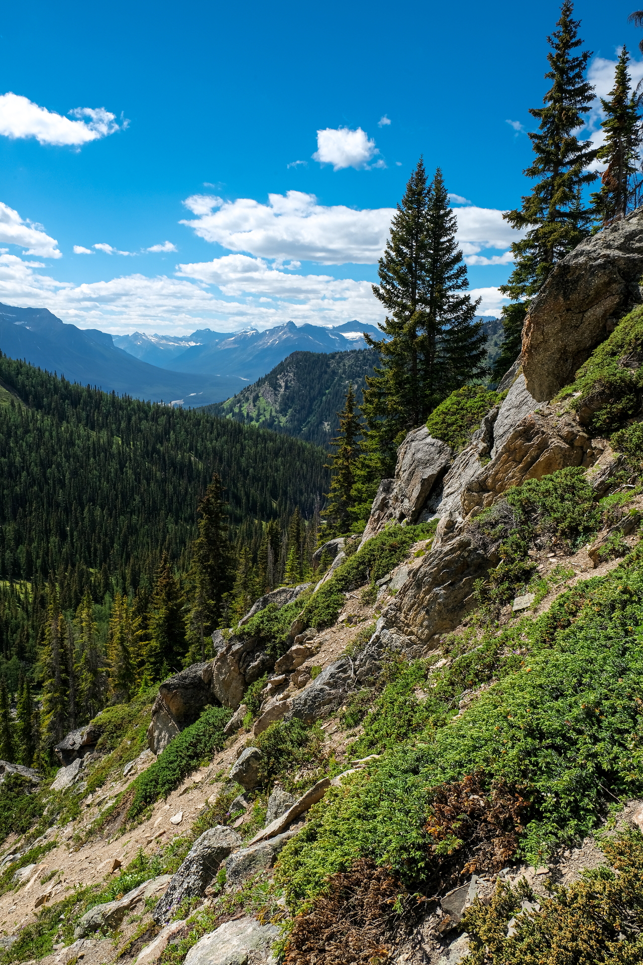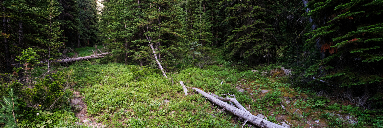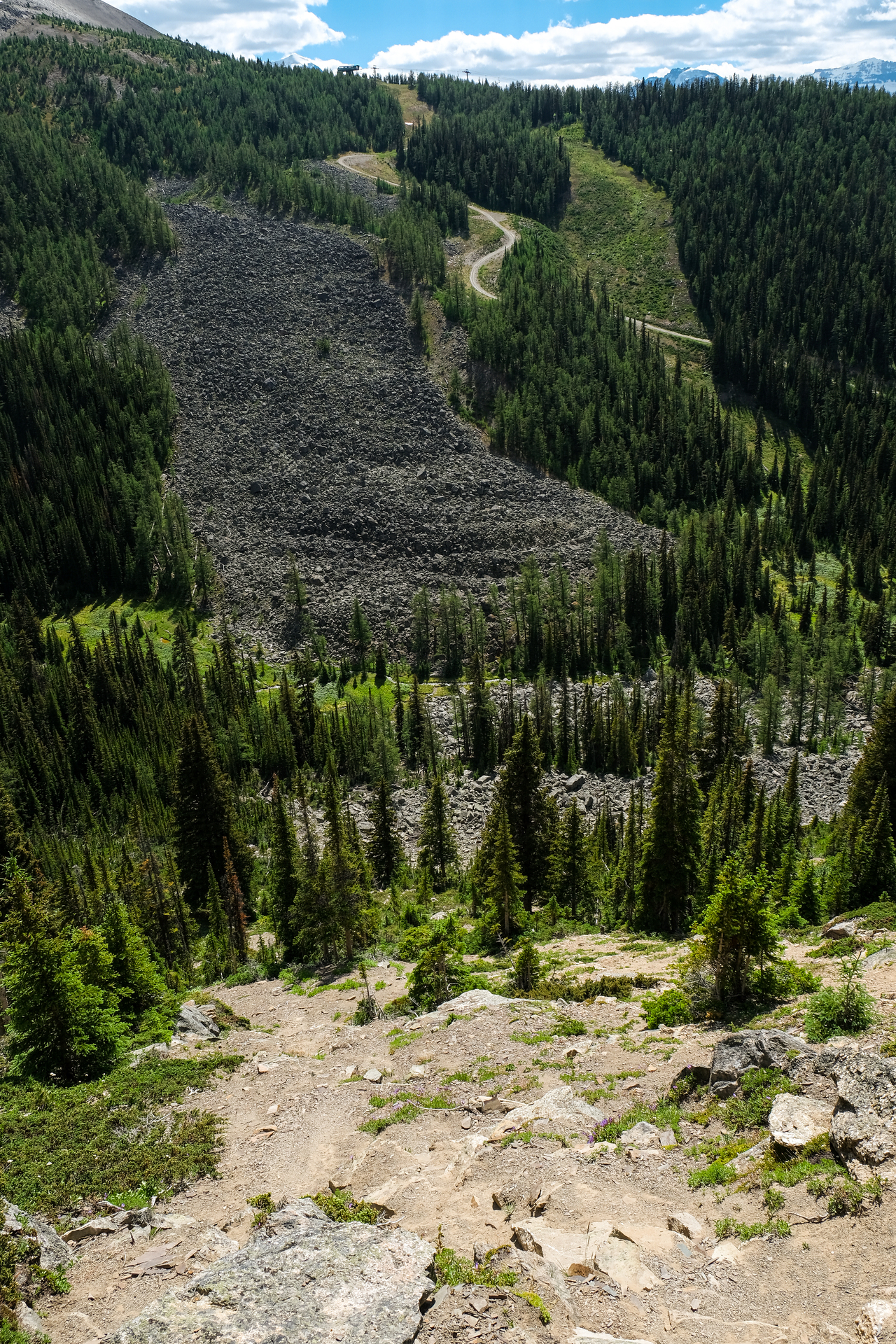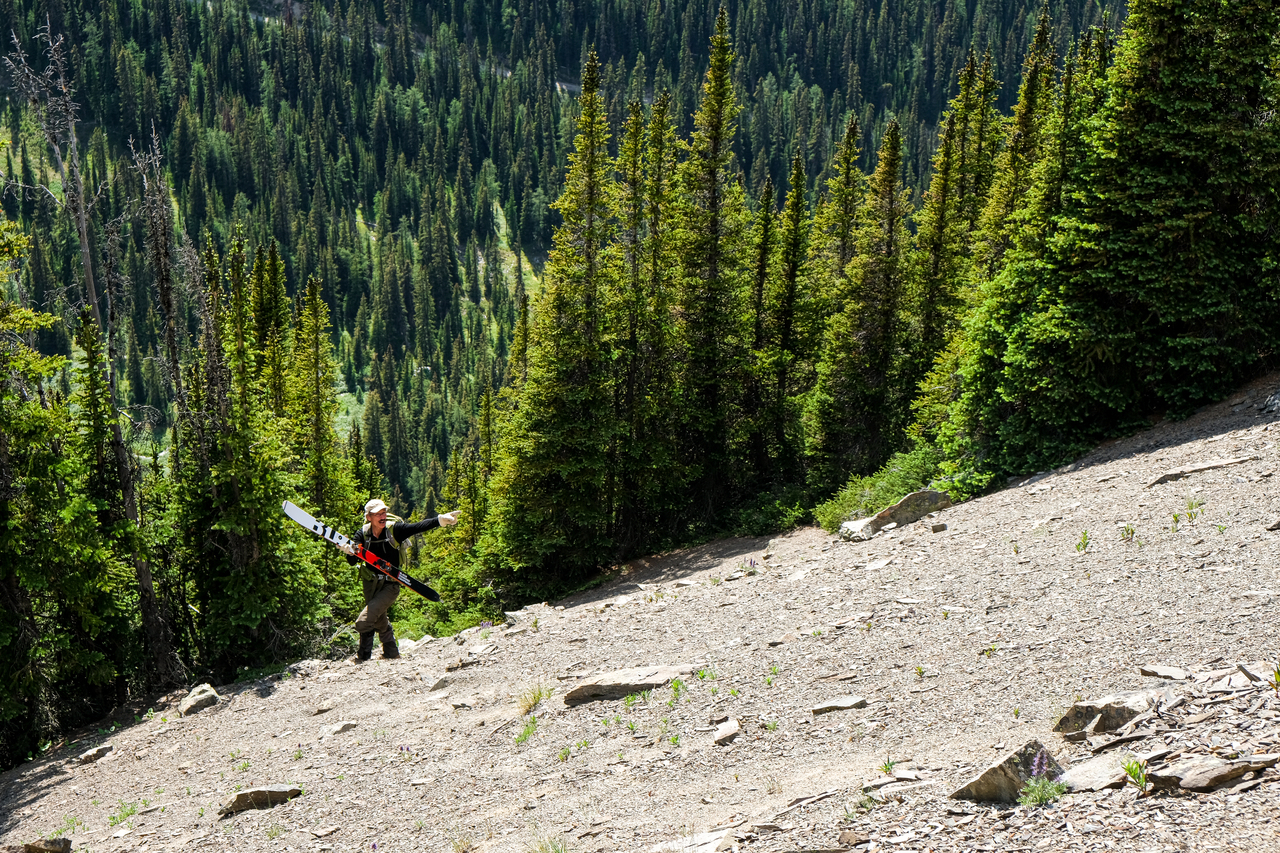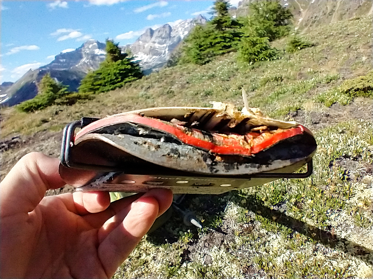 We easily followed the narrow trail for the final short distance down the valley, soon intersecting the well-travelled Skoki backcountry trail, and following it back to the access road. We got a couple funny looks from backpackers as we hiked down the remaining 4.5 km. I guess it's not normal to have a single ski strapped to your pack in the middle of summer 😂.