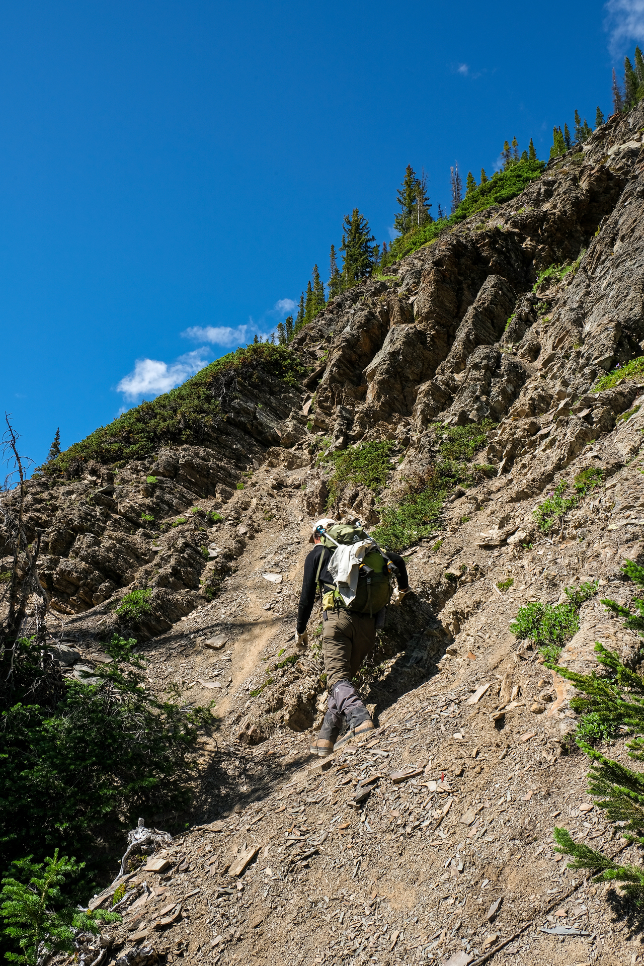 Navigating our way through the upper cliffs. We would often pause, scanning our surroundings, and even pulled out our binoculars a couple times when we noticed something shiny across the slope...Unfortunately it was never the ski :(.