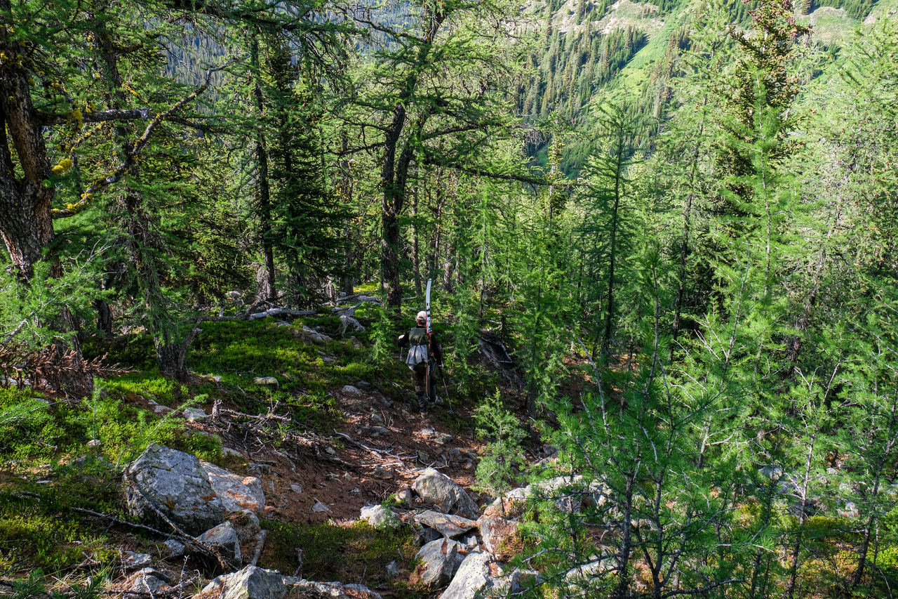 We soon reached the treeline, and easily continued down through the generously spaced larches.