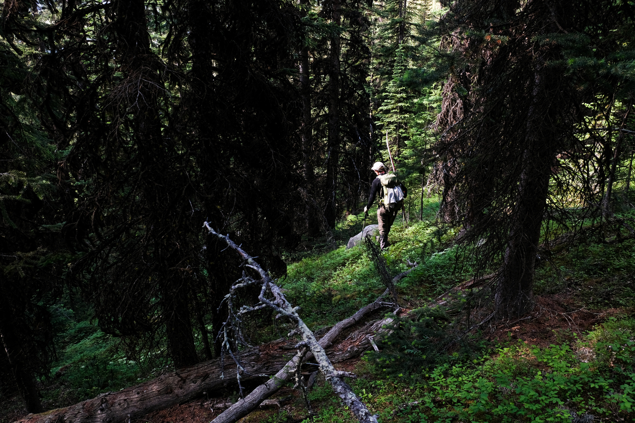 My dad starts up through the bush, camouflaged on the left side of the frame. In an ideal scenario, his ski would have travelled in a perfectly straight line down this slope. While that's extremely unlikely, given all the trees and rocks that could've changed its course, we decided that ascending in a straight line from where he lost it (marked on our GPS), would likely be our best starting point.
